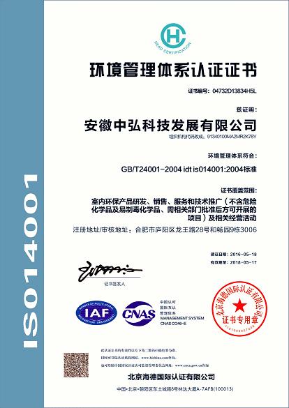 2016年5月18日,安徽中弘科技发展有限公司国验检验认证专家组审核认证,顺利取得ISO14001:2004 环境管理体系证书。