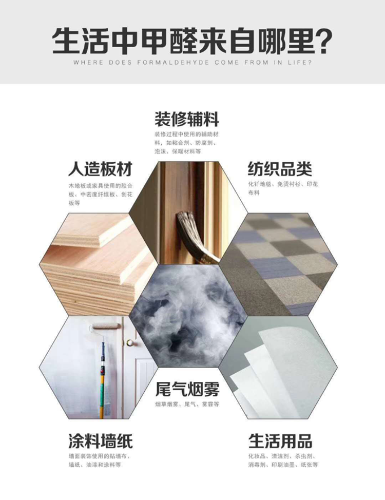 3、此外,工业废气、来自室外车辆废气、光化学烟雾也会在一定程度上排放或产生一定量的甲醛,这些污染也会随着空气的循环进入房间,有调查显示甲醛在城市的空气中。年平均浓度为0.005~0.01mg / m3。这部分气体进入房间,是室内甲醛污染的一部分来源,但这部分非常小。